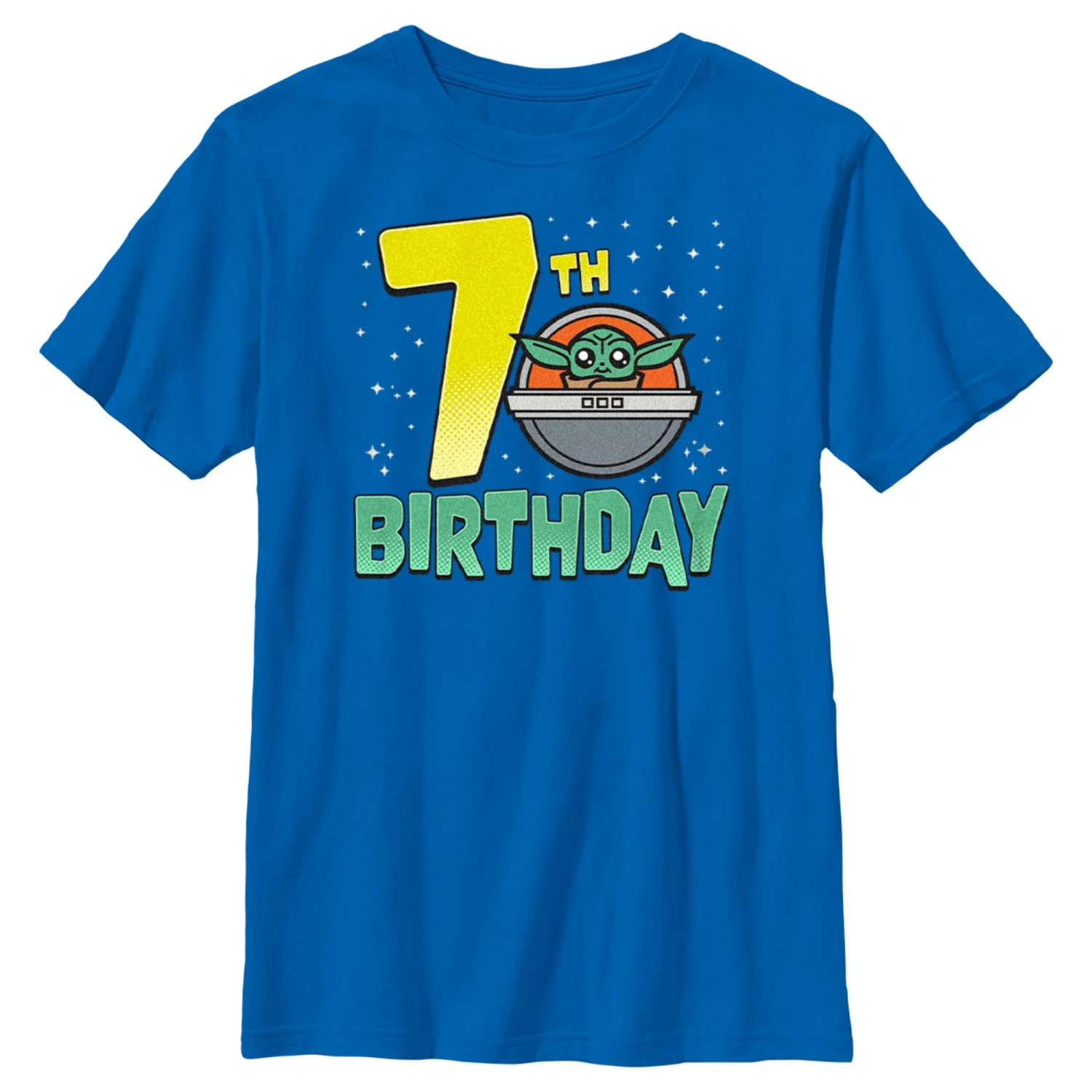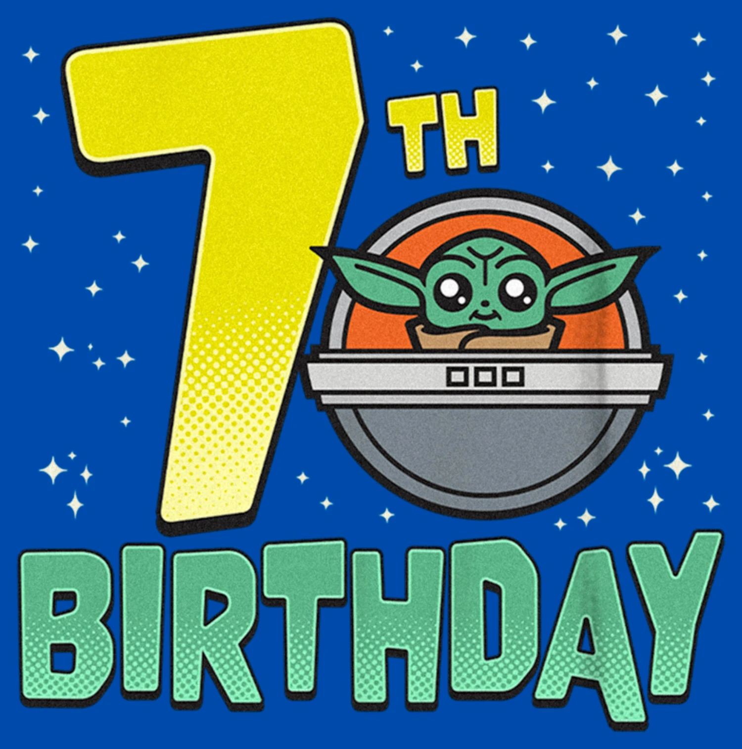 - Strut your stuff with this stylish new boys’ t-shirt that is perfect for Birthdays! Featuring Grogu, the cute green baby alien inside his bassinet in a cartoon art style, and “7th Birthday” across the front.