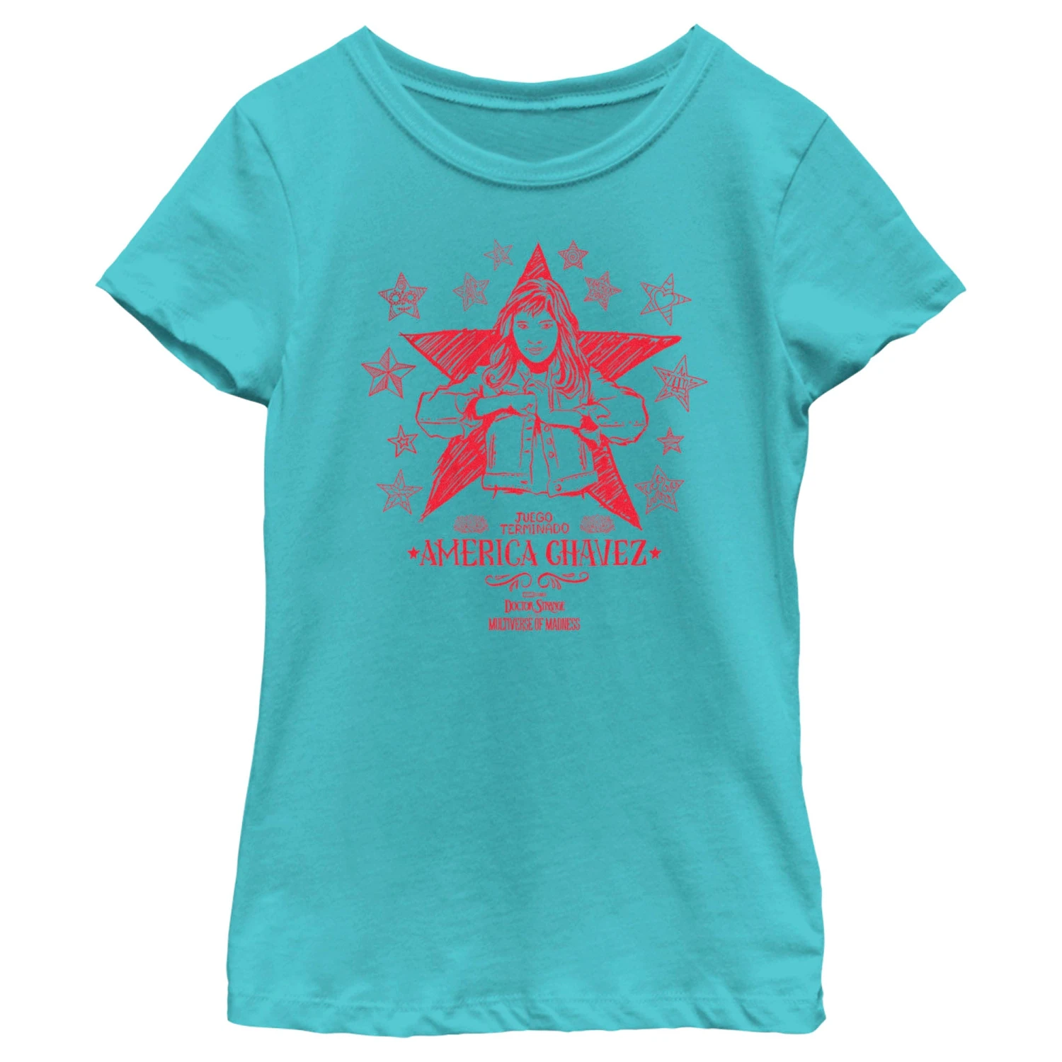 Join in the fight to save the world in this officially licensed design from Marvel’s Doctor Strange in the Multiverse of Madness! Featured on this adorable girls’ tee is a graphic of America Chavez in a red sketch. Don’t leave your heroes waiting in the wings and get this tee today!