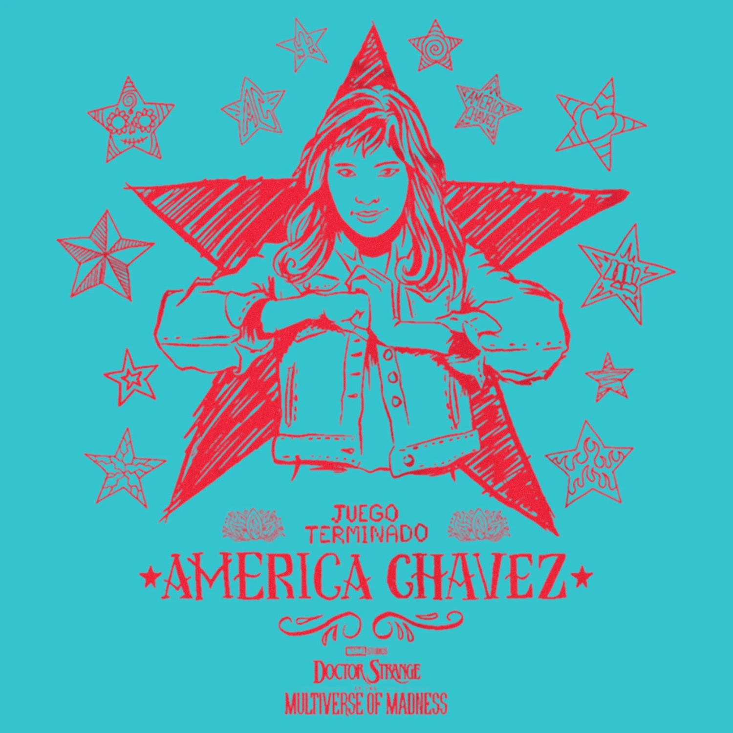 - Featuring a cool graphic of America Chavez sketched with her logo behind her