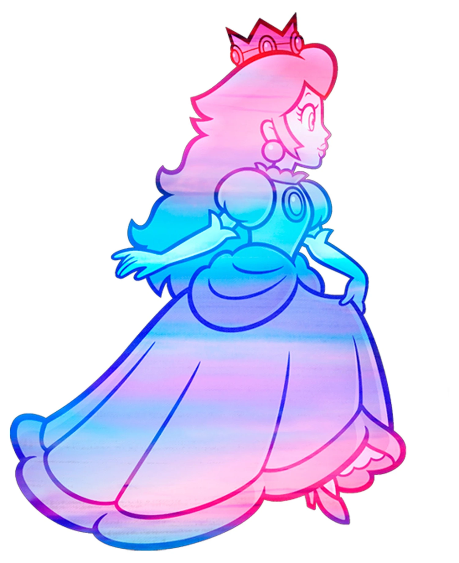 Princess Peach hates being kidnapped but at least she gets to wear the Nintendo Princess Peach Rainbow Fade Girls’ Tee! Princess Peach, portrayed in a cool rainbow style that fades from pink to blue, races across this fitted Nintendo tee.