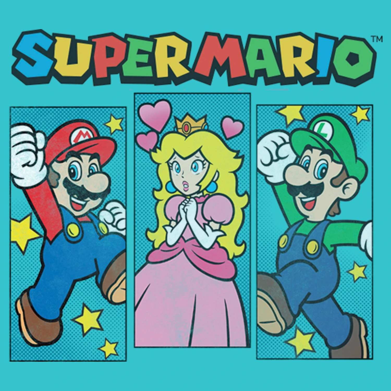Here we go! It’s time for some fun with the Nintendo Super Mario Brothers and Princess Peach Turquoise T-Shirt. Three boxes printed on the front of this cute Super Mario shirt feature Mario, Princess Peach, and Luigi with the Super Mario logo soaring above.