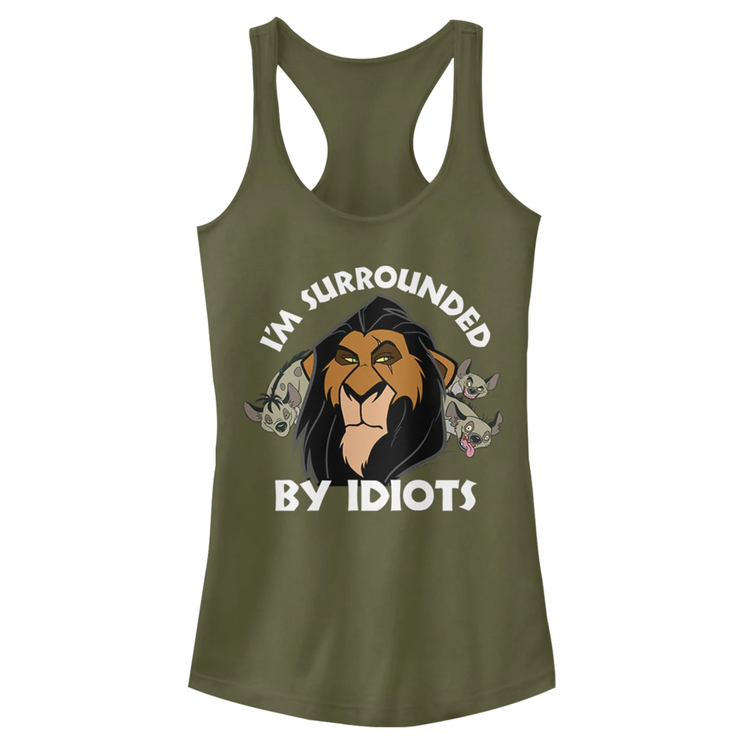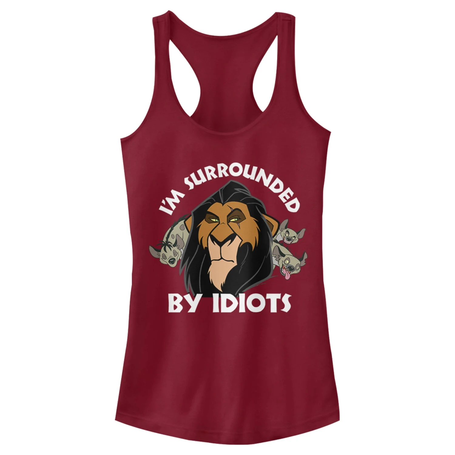Take over the Pride Lands with the Lion King Scar Surrounded by Idiots Juniors’ Racerback! Scar and his hyena allies are printed next to white letters that spell out “I’m Surrounded By Idiots” on the front of this cool black Lion King racerback.