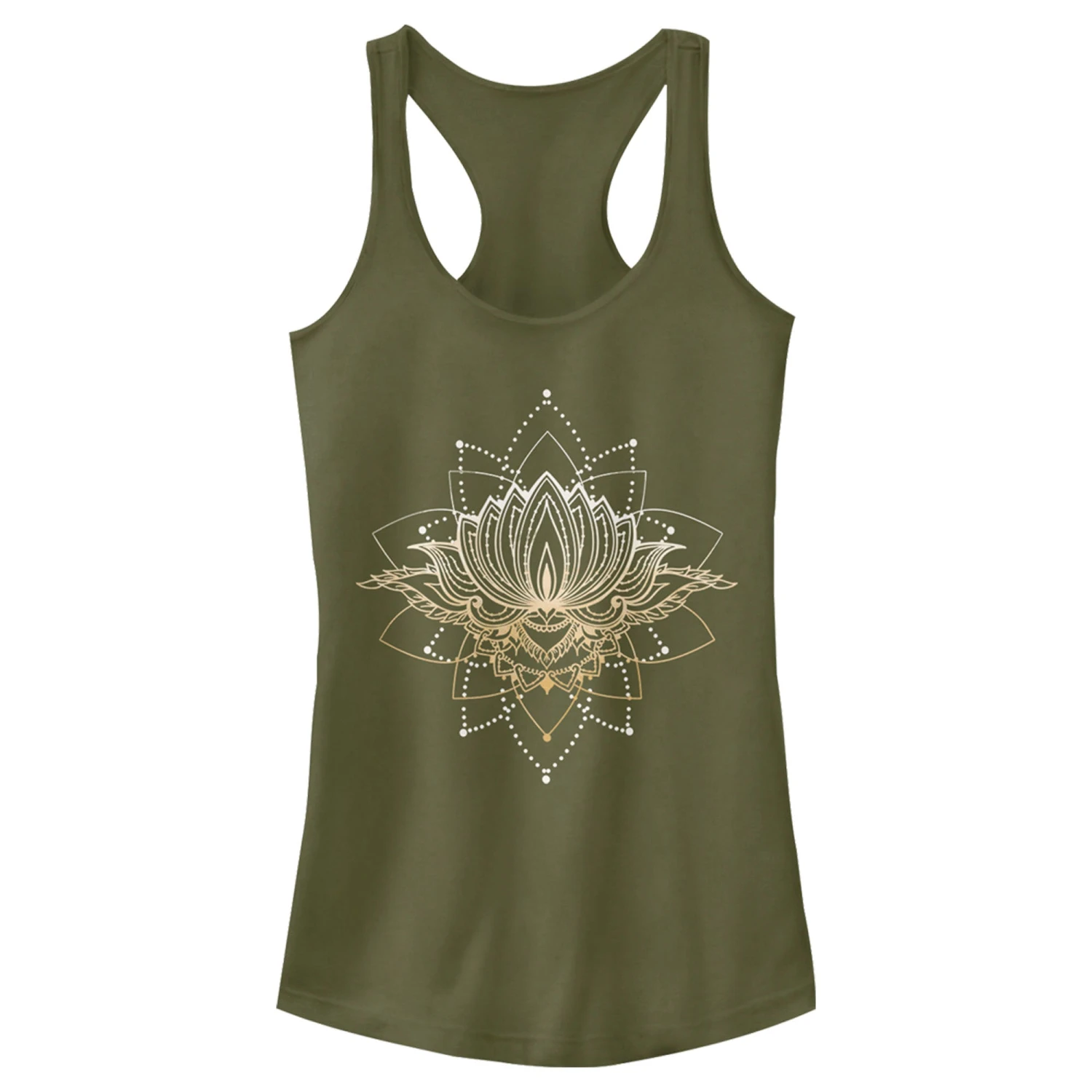 - Strut your stuff with this stylish new everyday Juniors’ Tank Top that is perfect for every occasion! Featuring a gilded lotus flower adorned across the front.