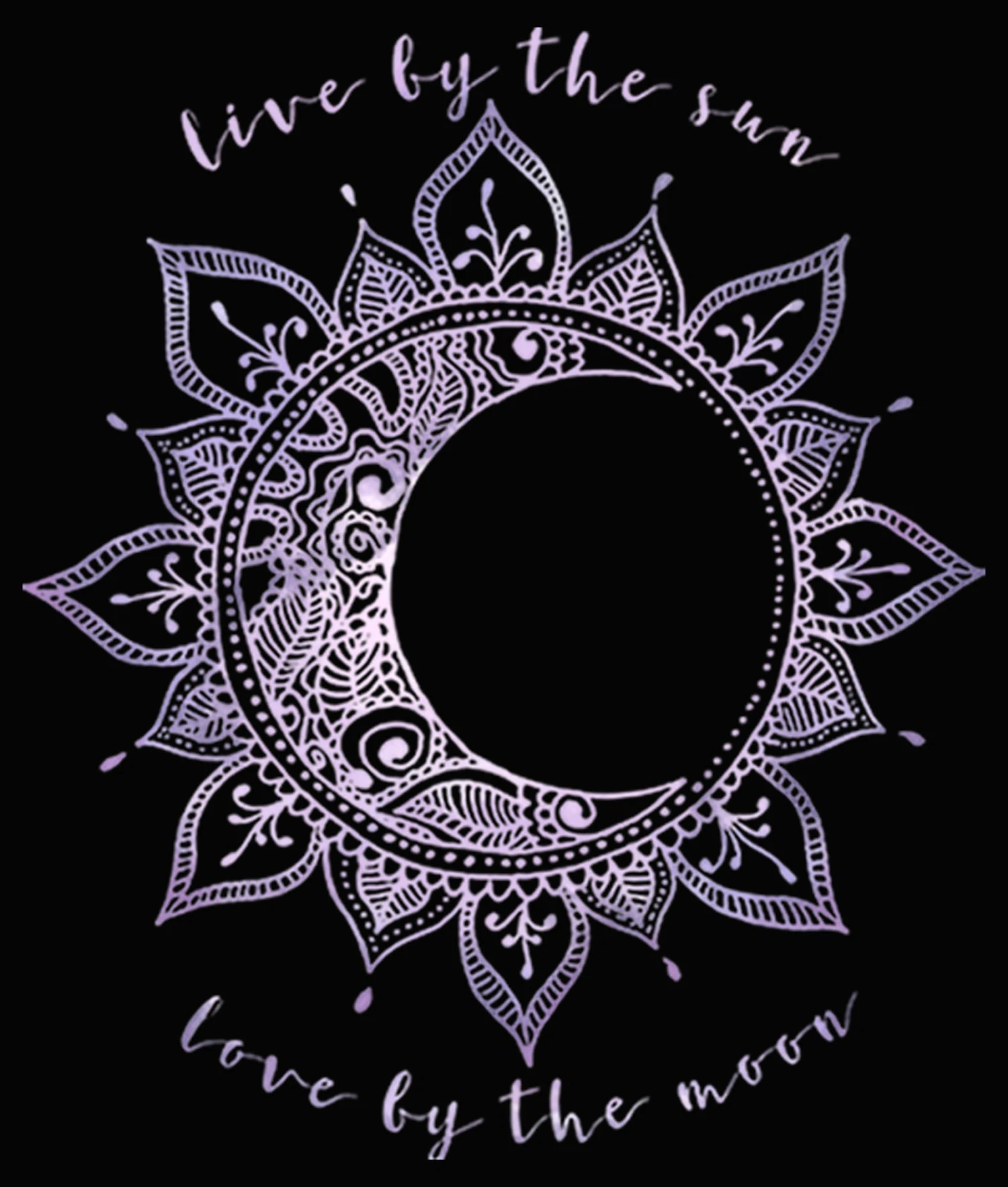 - Strut your stuff with this stylish new everyday Juniors’ Tank Top that is perfect for every occasion! Featuring a pretty graphic of the moon and the sun in a mandala style along with the text “Live by the Sun Love by the Moon” in purple script font.