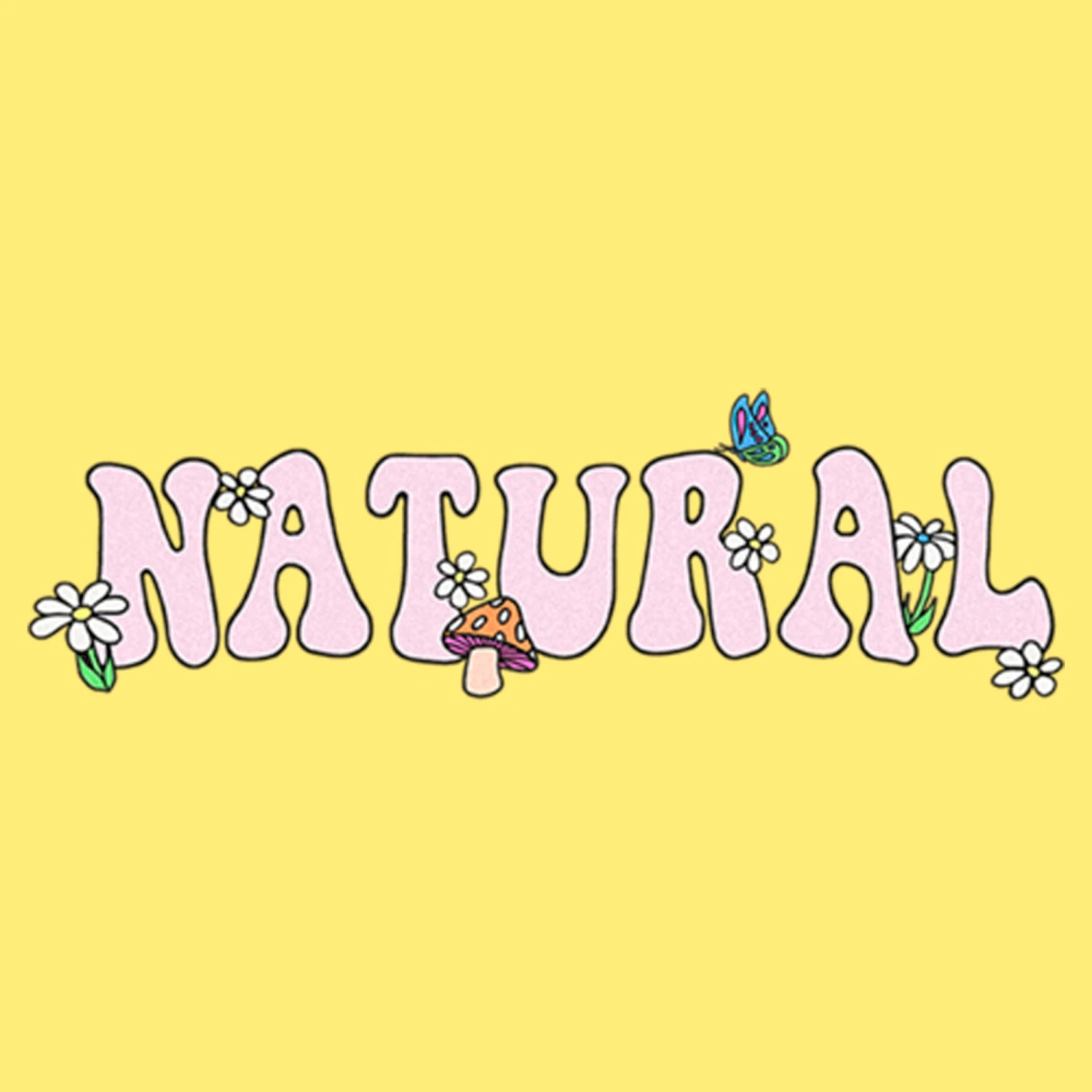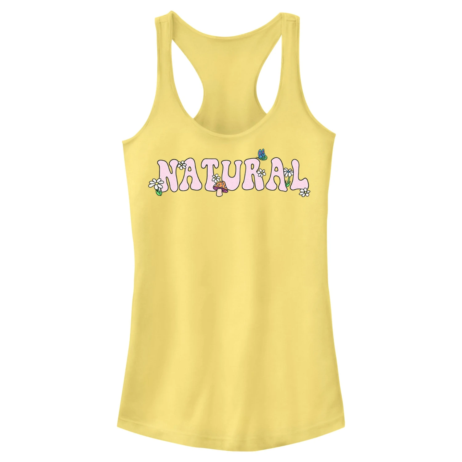 - Strut your stuff with this stylish new juniors’ racerback tank top that is perfect for every occasion! Featuring the word: “Natural,” with a mushroom, a butterfly, and daisies across the front.