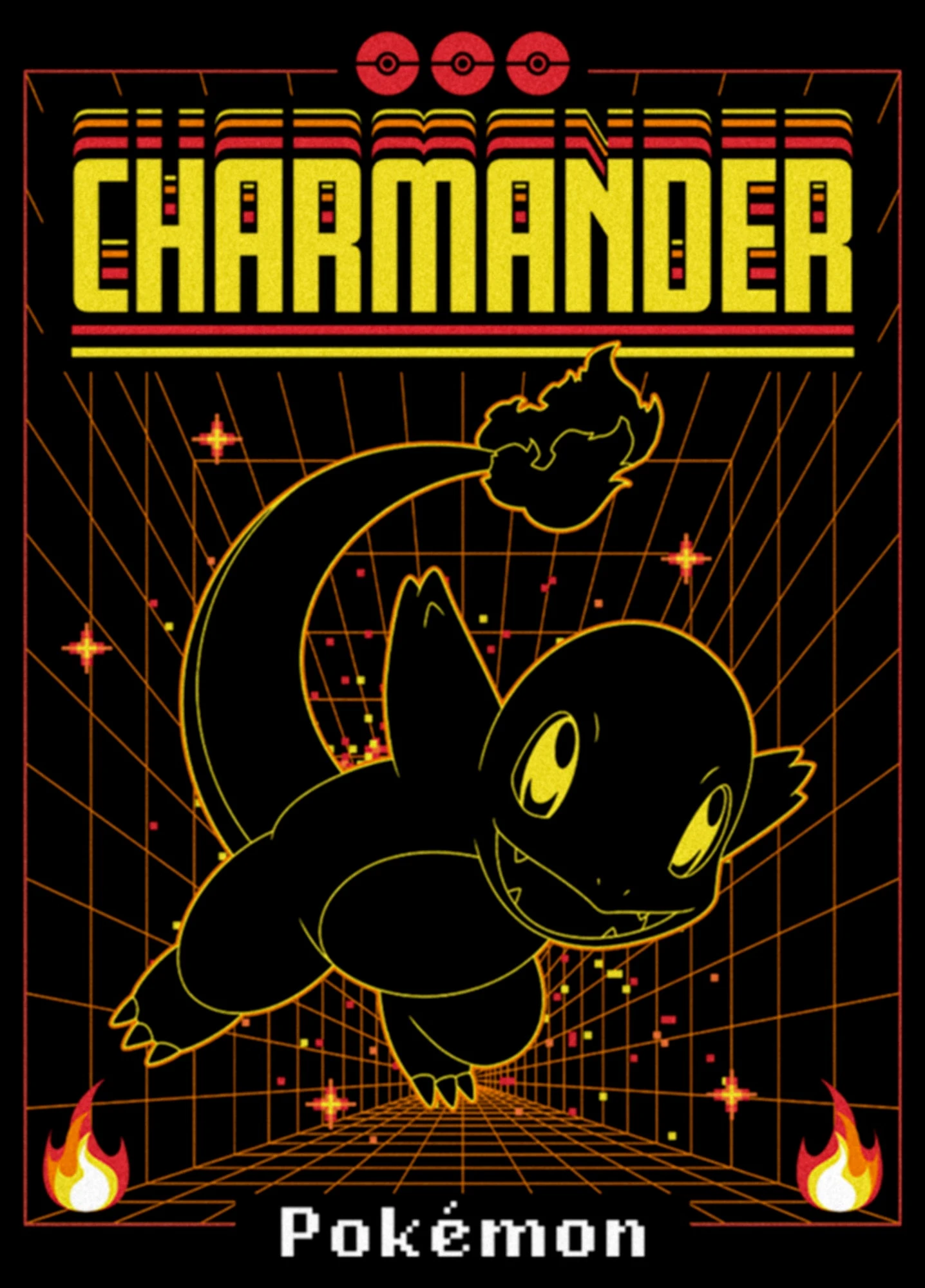 - Strut your stuff with this stylish new everyday juniors’ t-shirt that is perfect for every occasion! Featuring a cool, retro gamer grid with Charmander in outlined style showing off its iconic fiery tail.
