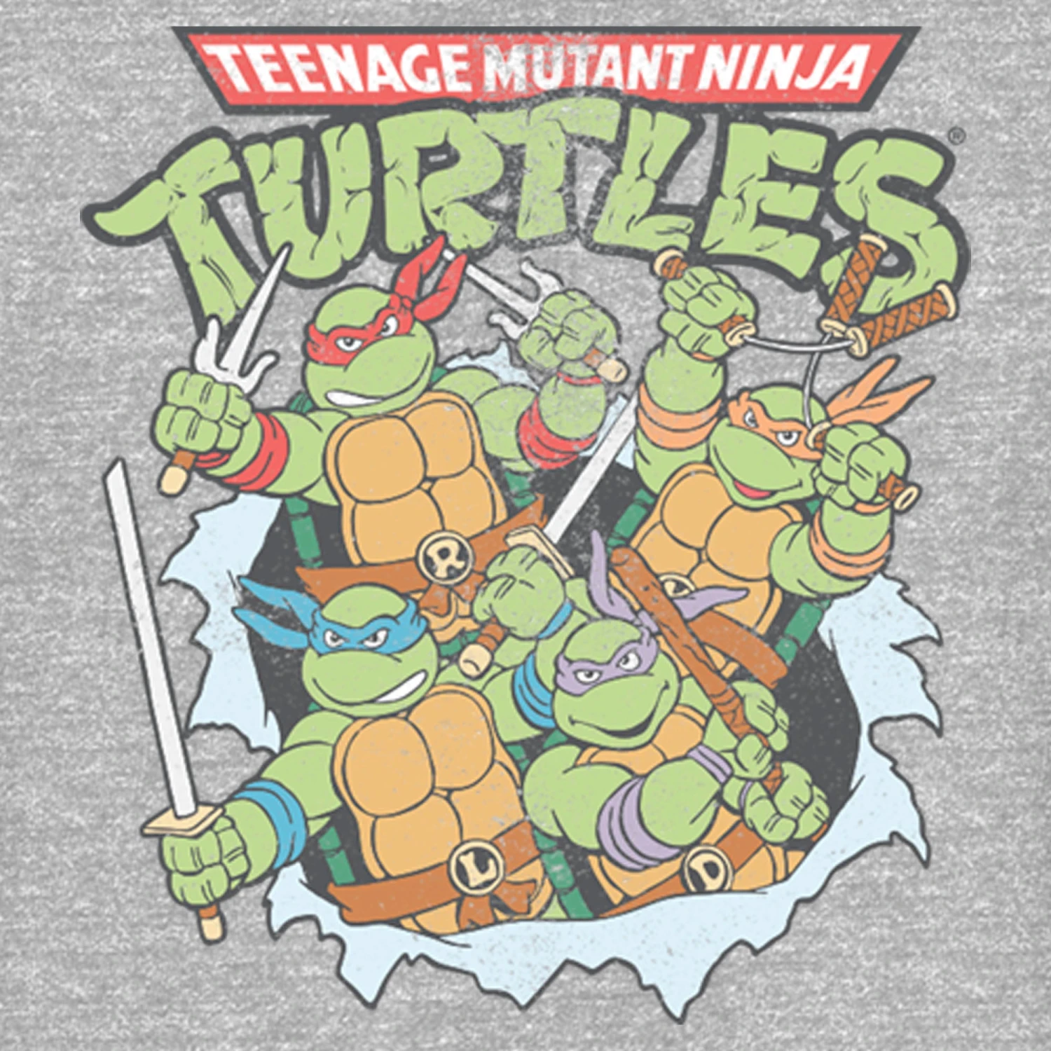 Cowabunga, dude! It’s time to explore the New York sewers, indulge in a little pizza, and get ready for the best adventure ever with an awesome officially licensed Teenage Mutant Ninja Turtles Juniors’ Distressed Team in Action Graphic T-Shirt featuring Donatello, Leonardo, Michelangelo, and Raphael popping out across the center and the classic franchise logo printed above them. If you’re planning on fighting the Foot Clan, do it in your favorite Teenage Mutant Ninja Turtles design today!