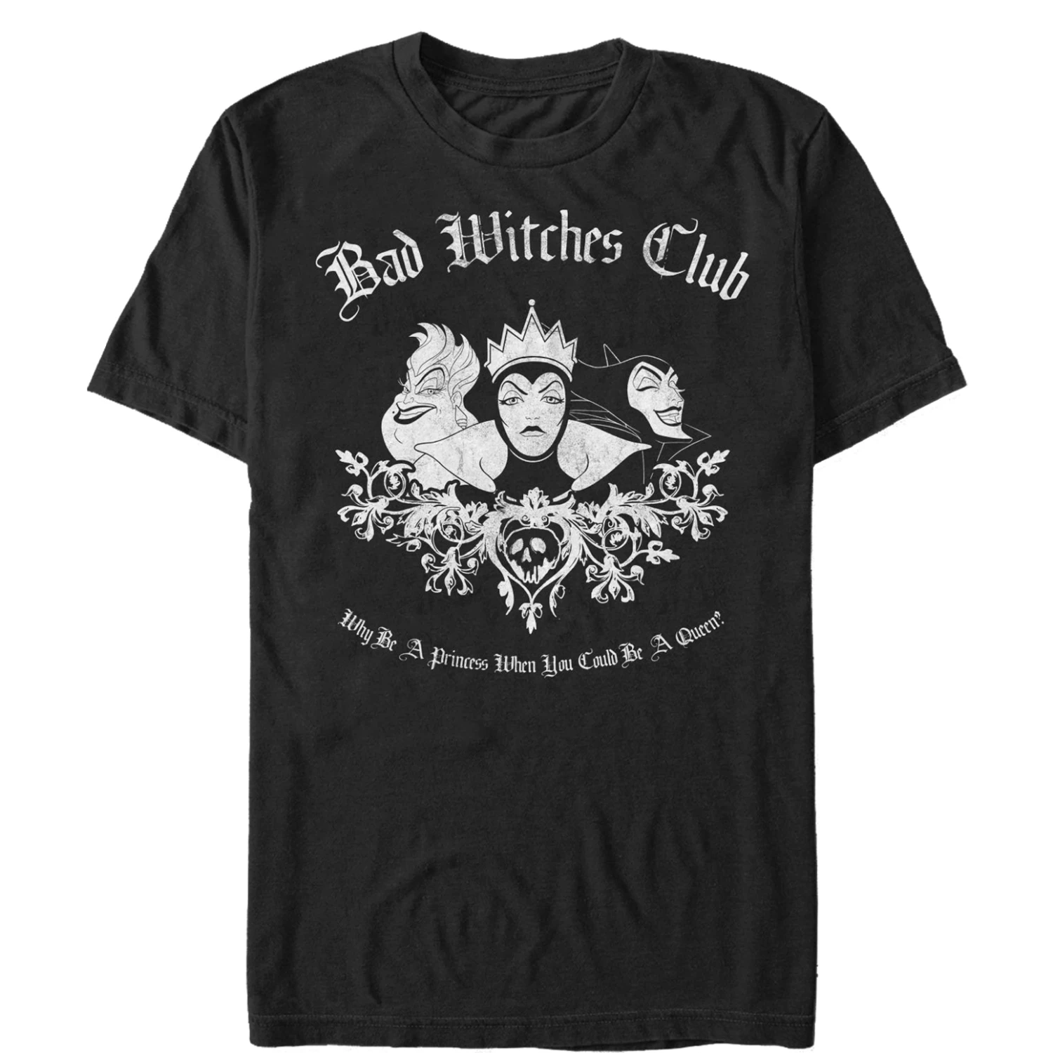 Be the big bad Queen you know you are with the Disney Bad Witches Club Men’s T-Shirt. A distressed graphic of Maleficent, Ursula, and the Wicked Witch are portrayed between “Bad Witches Club Why Be A Princess When You Can Be a Queen” in cool vintage text.