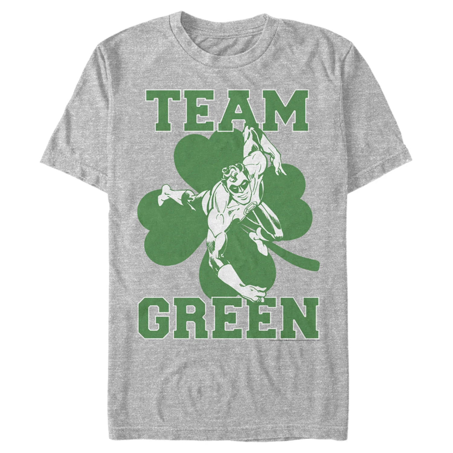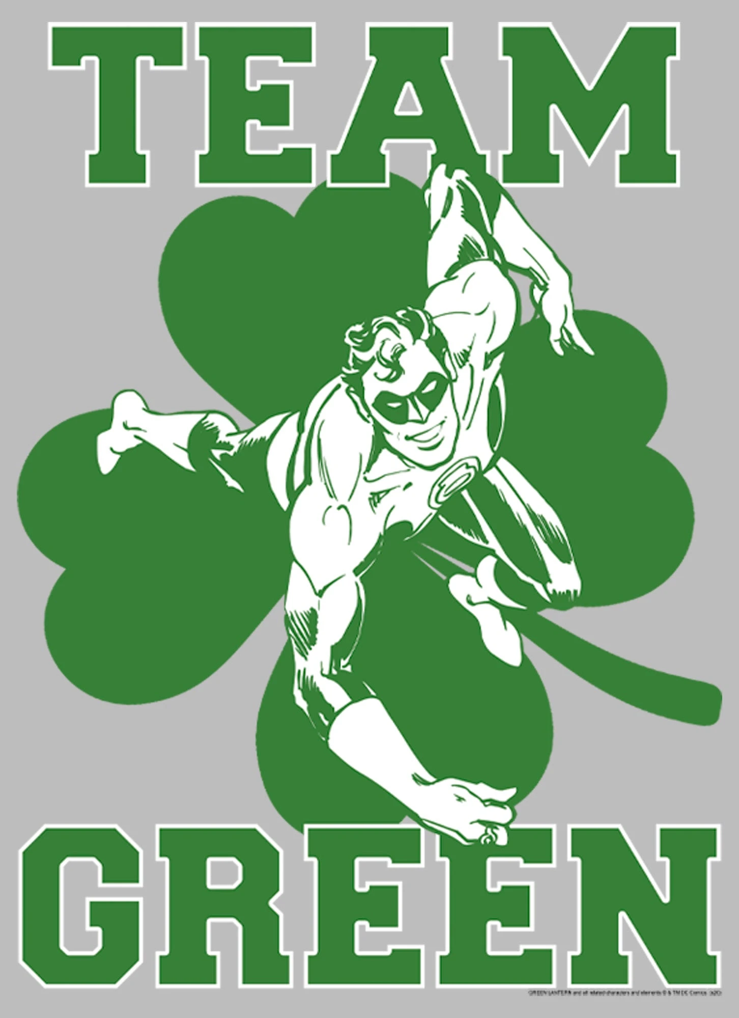- This design features the Green Lantern with a shamrock behind him and the words “Team Green”