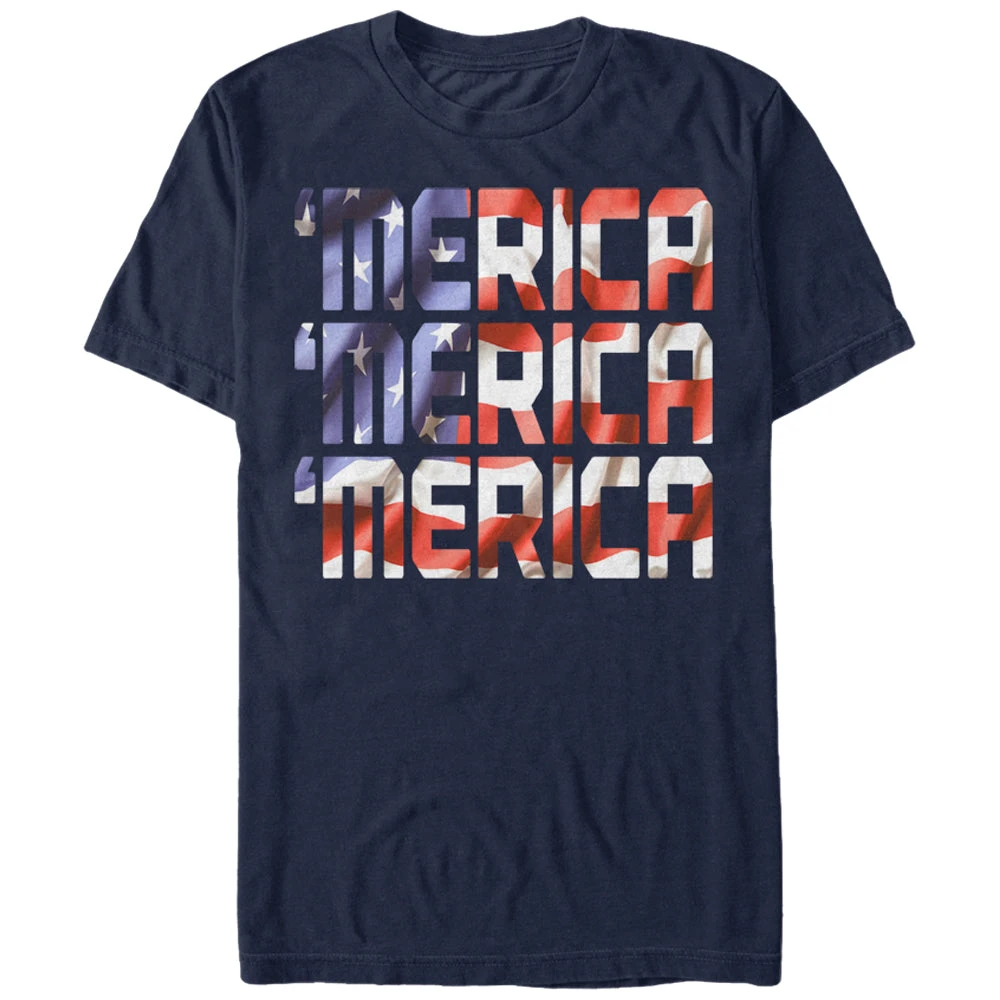 Show your spirit with the Lost Gods 4th of July Merica Flag Navy Blue T-Shirt. “‘Merica ‘Merica ‘Merica” is printed with the stars and stripes of the American flag on this T-shirt.