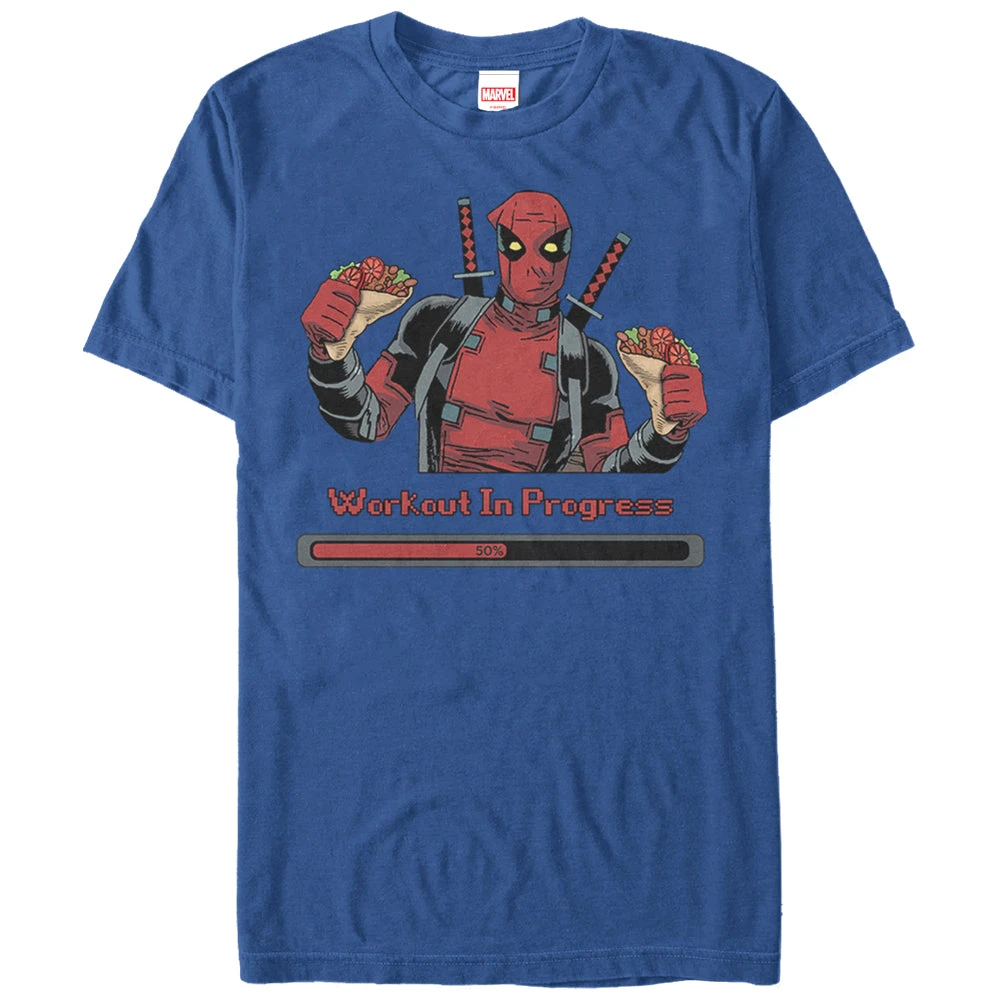 We all know Deadpool has his own way of doing things and his workouts are no different on the Marvel Deadpool Workout in Progress Royal Blue T-Shirt. Deadpool is featured holding two tacos with “Workout in Progress” in red beneath him.