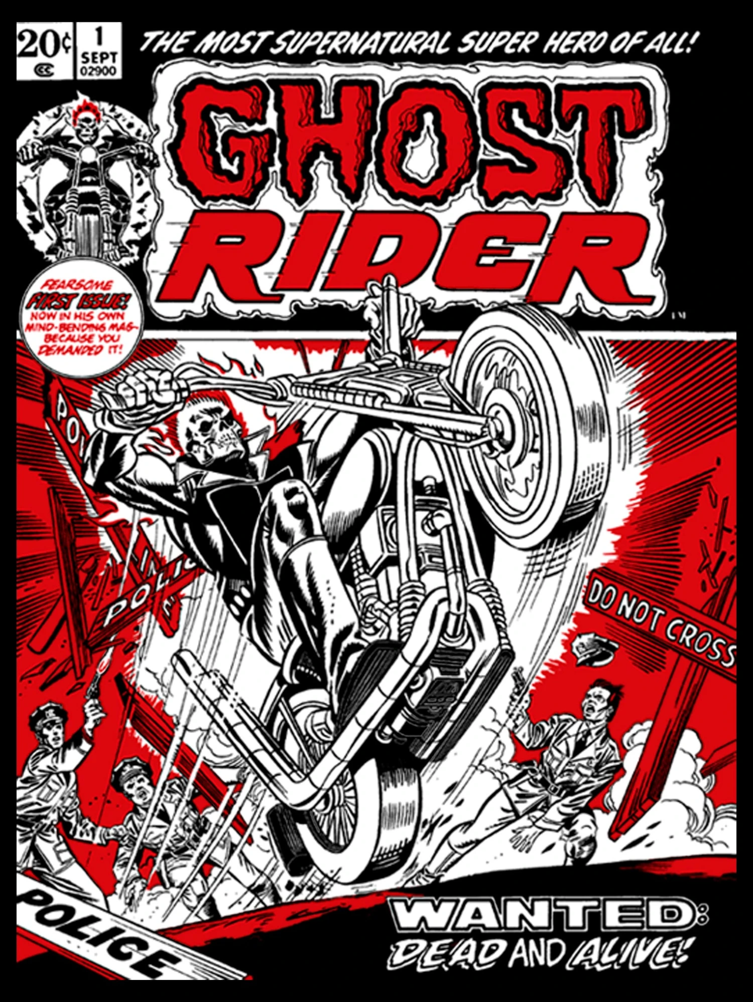 Not a bullet, not a knife, not even the Marvel Ghost Rider Comic Book Cover Print Black T-Shirt can stop the immortal Ghost Rider! This durable black shirt commemorates Ghost Rider’s first appearance on the comic book cover “Ghost Rider vol. 2 #1 (September 1973)” which features Ghost Rider speeding away on his deadly motorcycle.