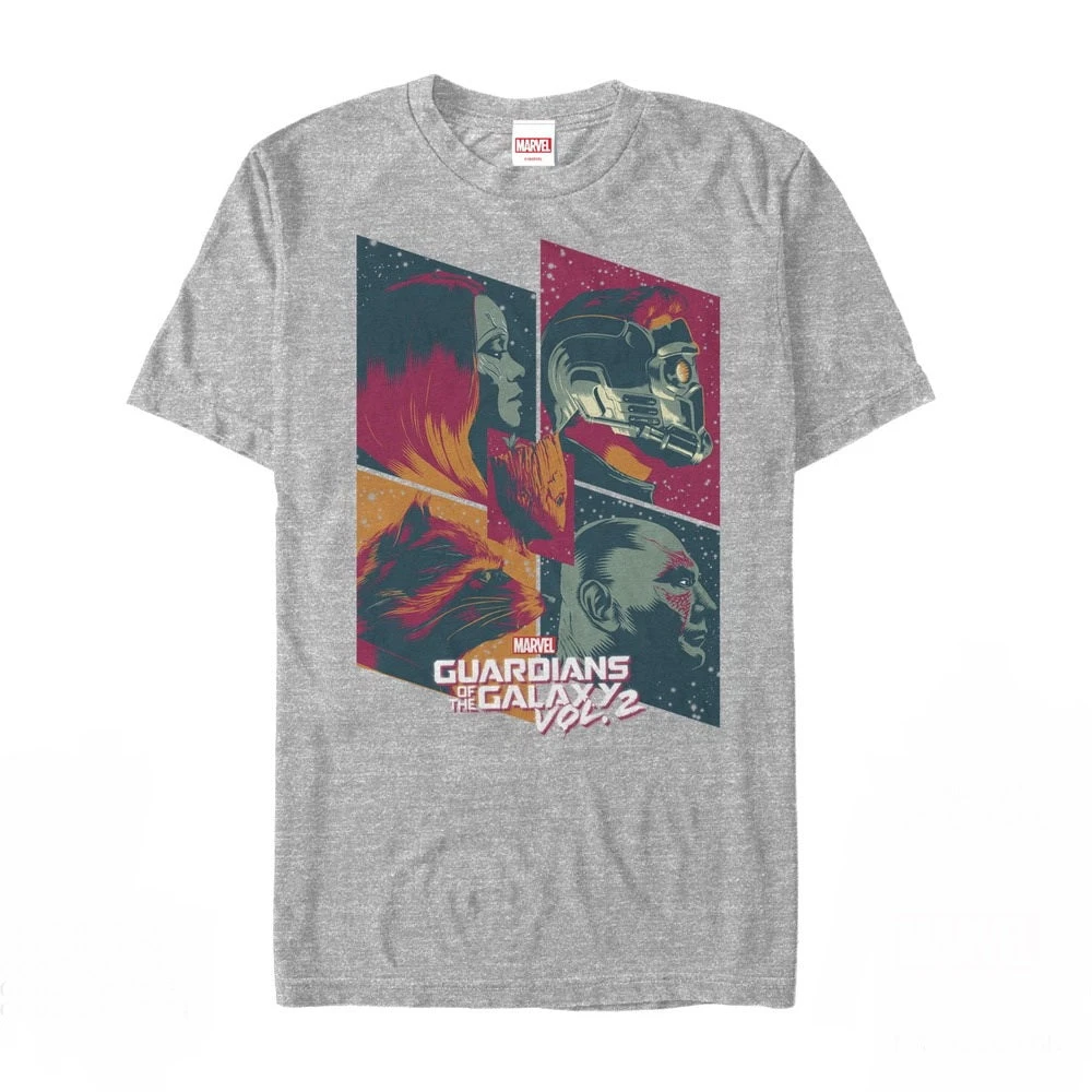 A group of loners find friendship, family, AND style with the Marvel Guardians of Galaxy Vol. 2 Team Five Heather Gray T-Shirt. The best members of the Guardians of the Galaxy: Gamora, Rocket, Baby Groot, Star-Lord, and Drax are portrayed in an epic ombre style that fades from red, orange, and gray down this cool Guardians of the Galaxy Volume 2 shirt.