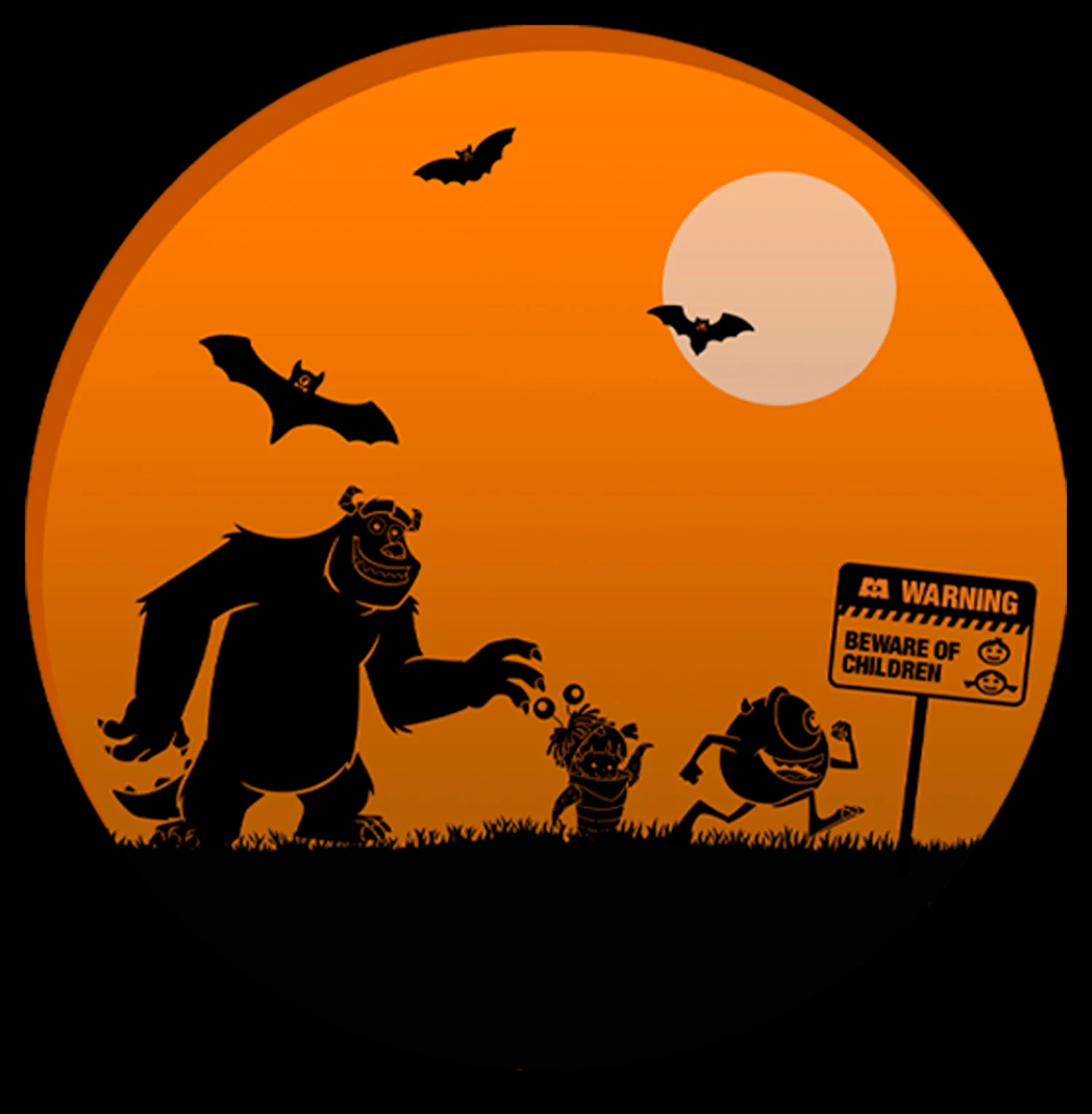 - Strut your stuff with this stylish new Halloween men’s tee featuring Sully, Boo, and Mike walking through a field on an All-Hallows’ Eve moon-lit night while being surrounded by bats and a warning sign that reads: “Beware of Children.”
