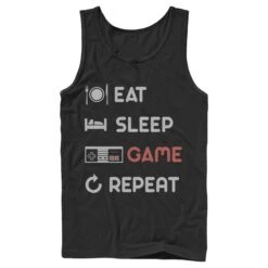 Kick it old school with this Nintendo Eat Sleep NES Game Repeat Men’s Tank! Pop open an issue of Nintendo Power, enter that cheat code, enjoy infinite lives, and look great doing it!