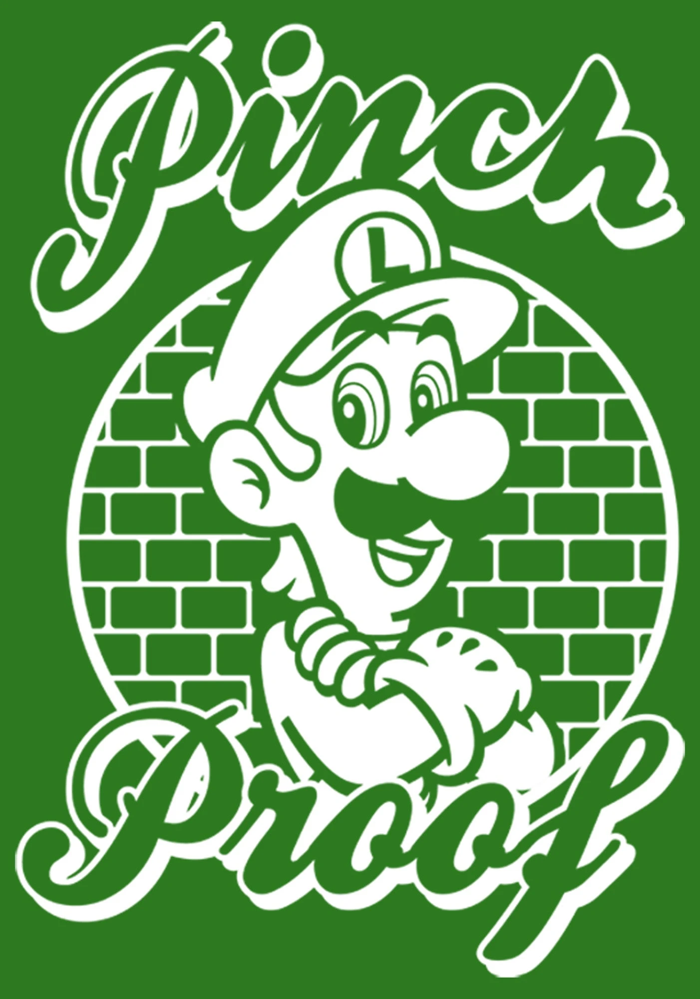 - This retro design features the words “Pinch Proof” with Luigi smiling and crossing his arms!