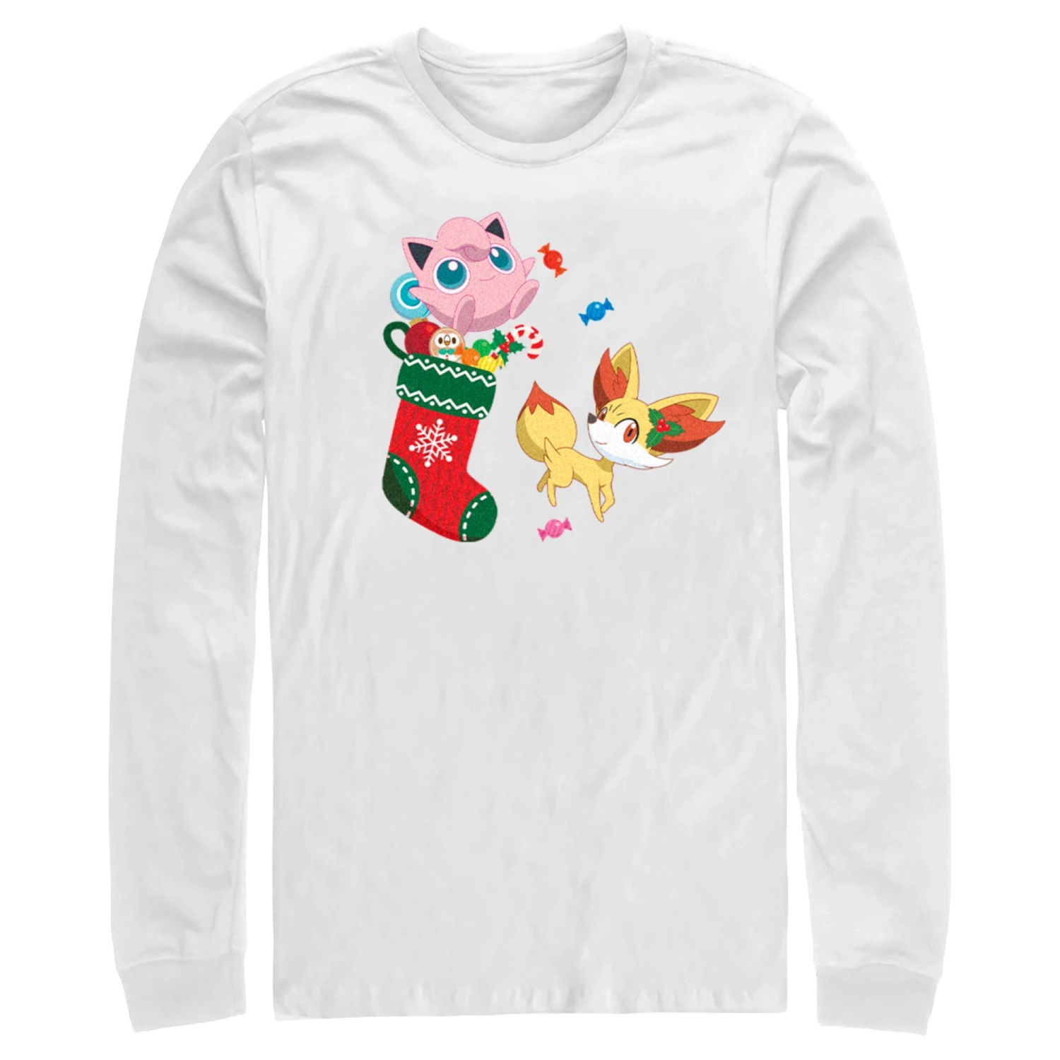 - Strut your stuff with this stylish new Christmas Men’s Long Sleeve T-Shirt that is perfect for the holidays! Featuring Jigglypuff, Fennekin, Rowlet, and a Christmas stocking filled with candies and ornaments.