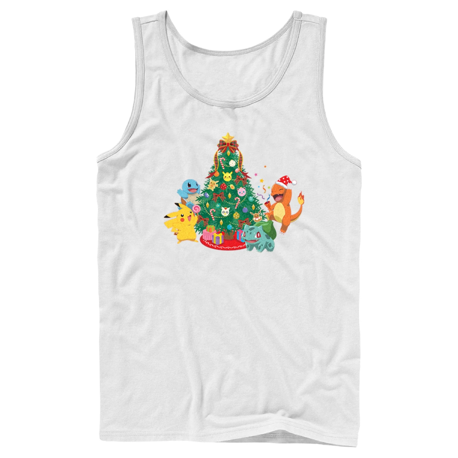 - Strut your stuff with this stylish new Christmas Men’s Tank Top that is perfect for the holidays! Featuring Pikachu, Squirtle, Charmander, and Bulbasaur celebrating around a Christmas tree decorated with candy canes, bows, festive lights, and Pokemon-shaped ornaments, including Jigglypuff, Delibird, and Eevee.