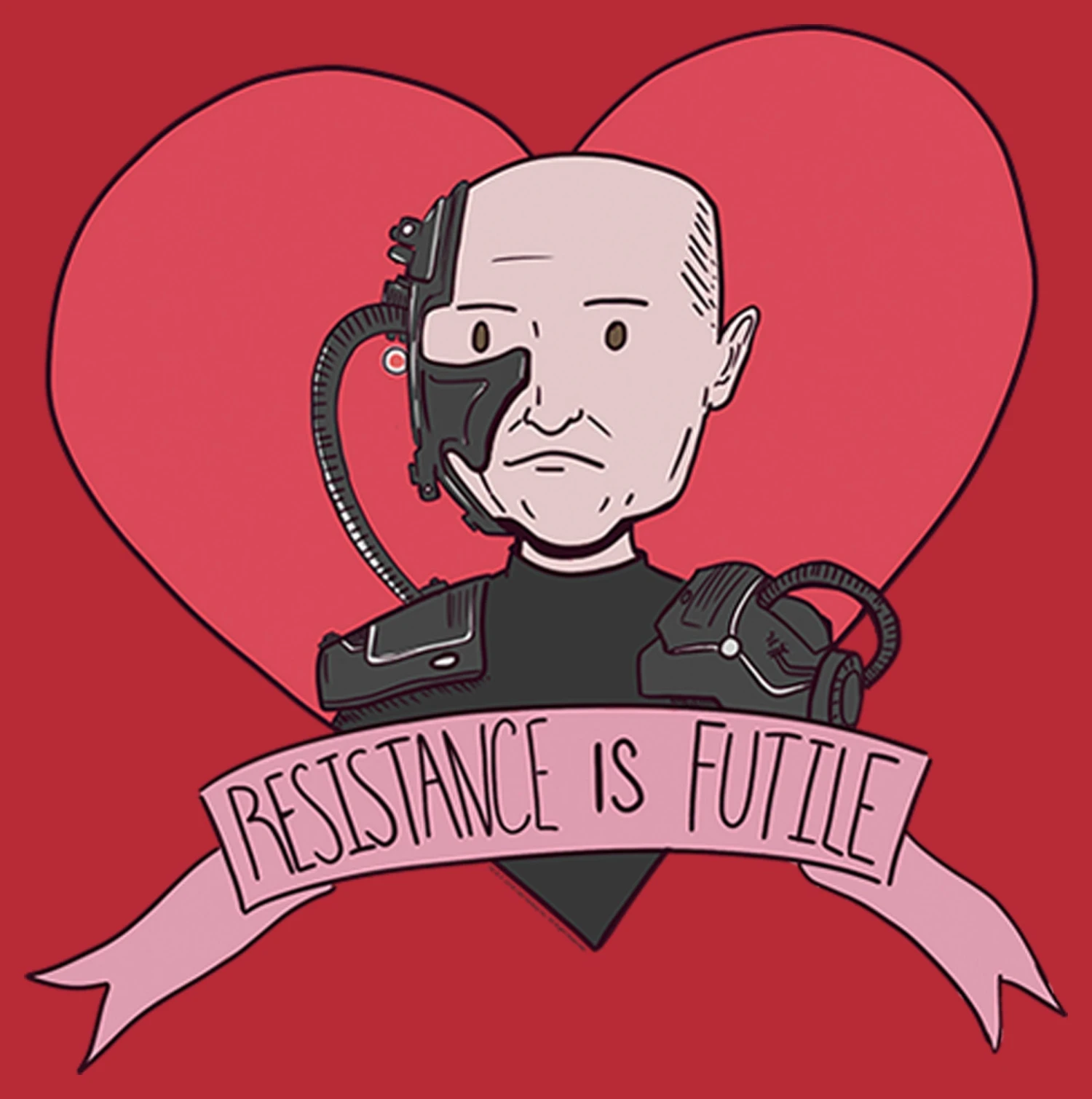 - This adorable design features Captain Picard assimilated by the Borg with the words “Resistance is Futile” inside a heart!