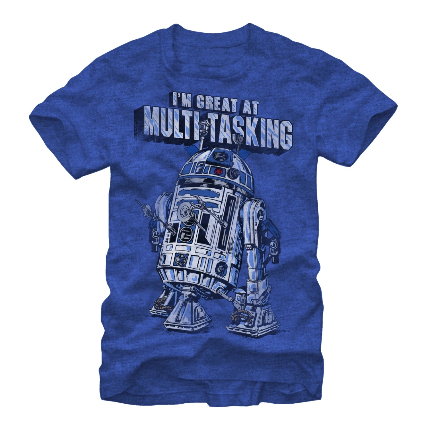 Celebrate the many talents of your favorite feisty little droid with the Star Wars R2-D2 Great at Multitasking Heather Royal Blue T-Shirt. R2-D2 pulls out all his gadgets including a saw and periscope with “I’m Great at Multitasking” printed above him on the front of this funny blue R2-D2 shirt.
