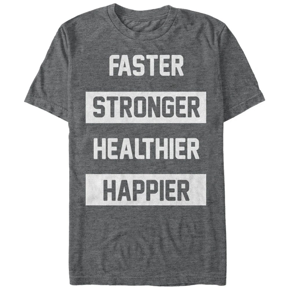 You can be the best version of yourself with the Chin Up Faster Stronger Healthier Happier Heather Charcoal Boyfriend Tee. This motivational oversized gray shirt displays “Faster Stronger Healthier Happier” in bold white block-style letters down the front.