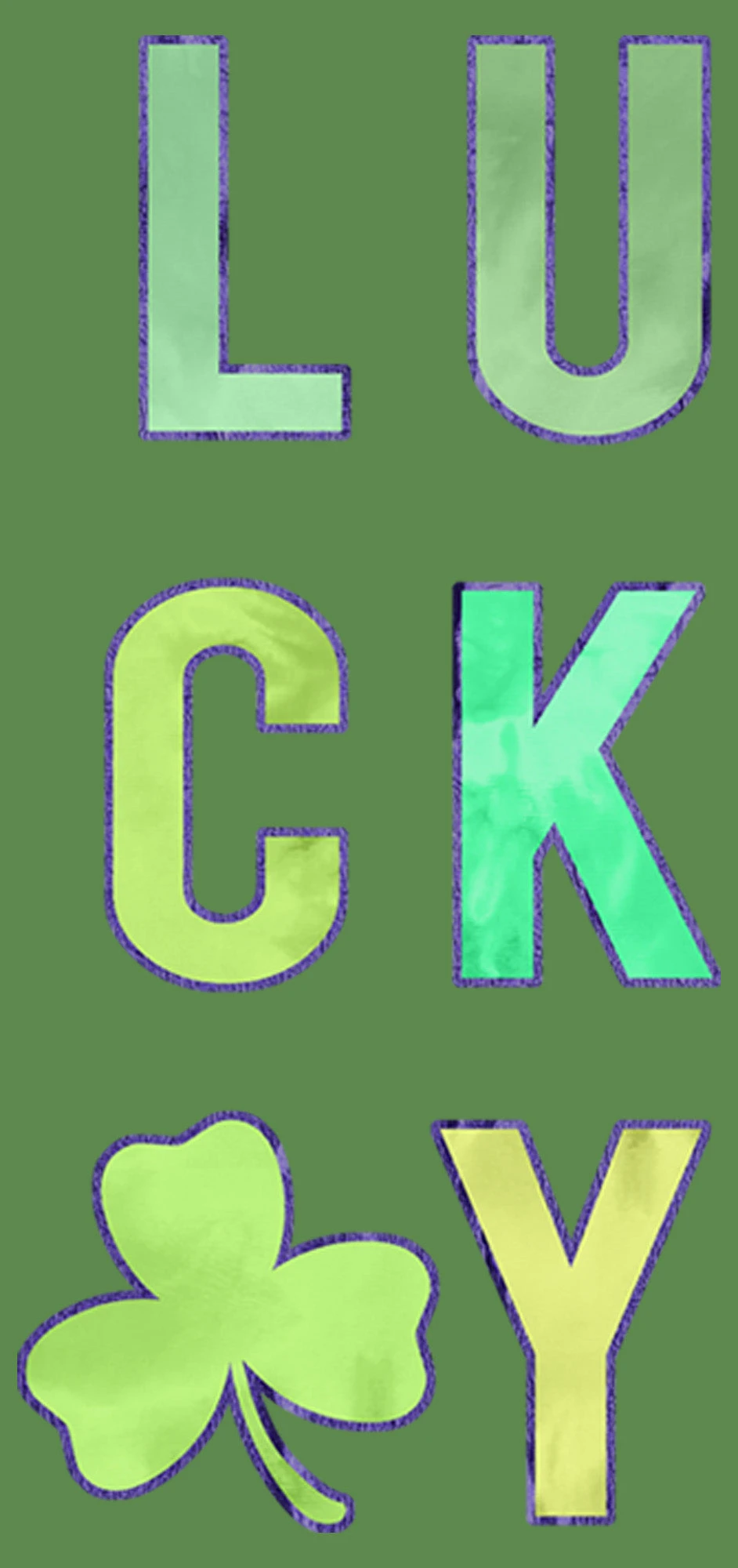 - Featuring a shamrock with the word “Lucky” broken up and stacked, filled in with cool green tie-dye!