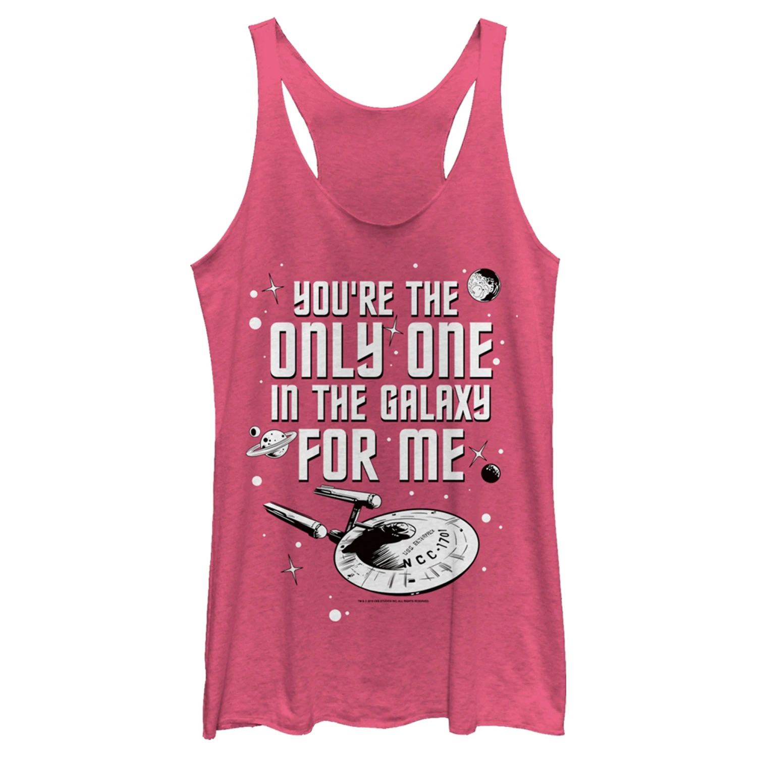 Beam me up Scotty! Follow the crew of the starship USS Enterprise as it completes daring space missions in the 23rd century, featuring all your favorites like Captain Kirk, Spock, and more! This officially licensed Women’s Valentine’s Only One In Galaxy Racerback Tank Top features the USS Enterprise and “You’re the only one in the galaxy for me” printed across the front! Grab yours today and “Live Long and Prosper!”