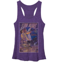 Recapture the excitement of the first time you saw Star Wars with the Star Wars Cinema Poster Heather Purple Racerback Tank Top. Vintage-style artwork on the front of this soft and breathable top features Luke Skywalker, Princess Leia, Han Solo, Darth Vader, and more.