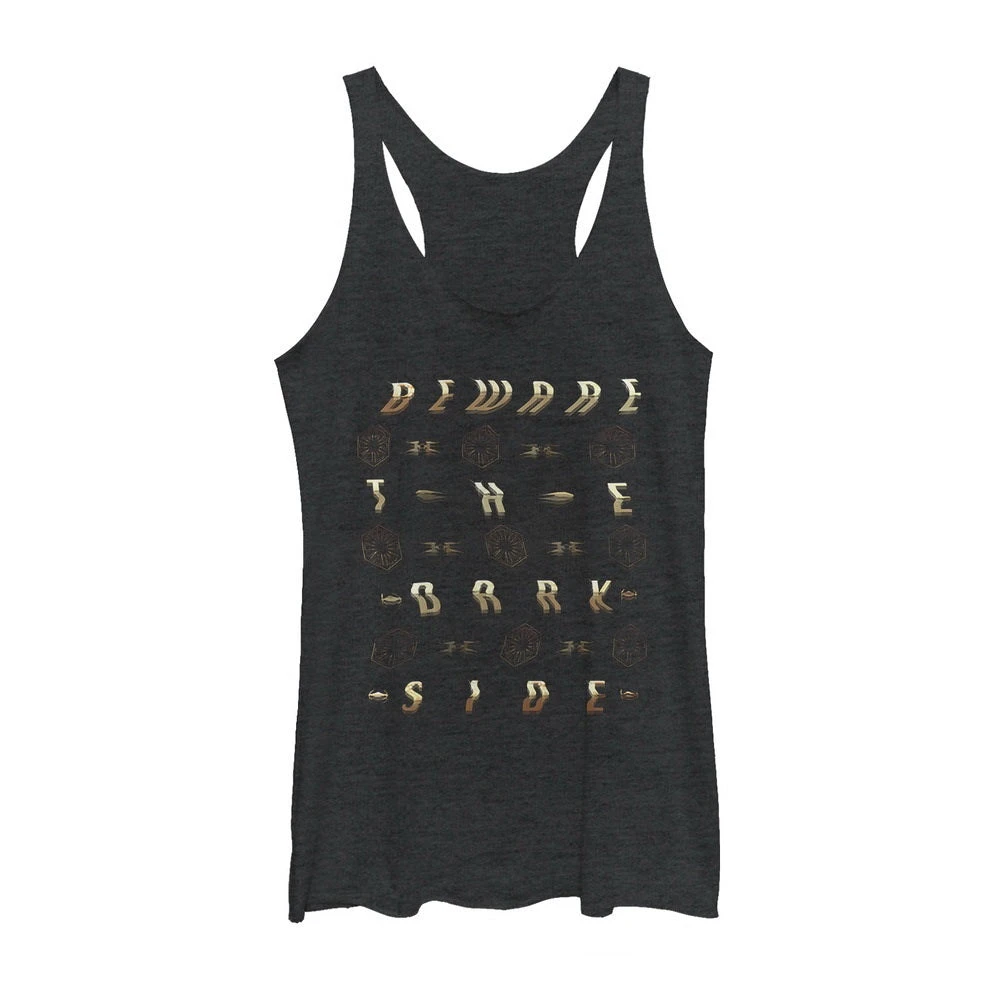 The call of the dark side is hard to resist, and so is the call of the Star Wars The Last Jedi Beware Dark Side Distort Heather Black Racerback Tank Top! This unique soft black Episode 8 tank reads “Beware the Dark Side” in an awesome distorted style.