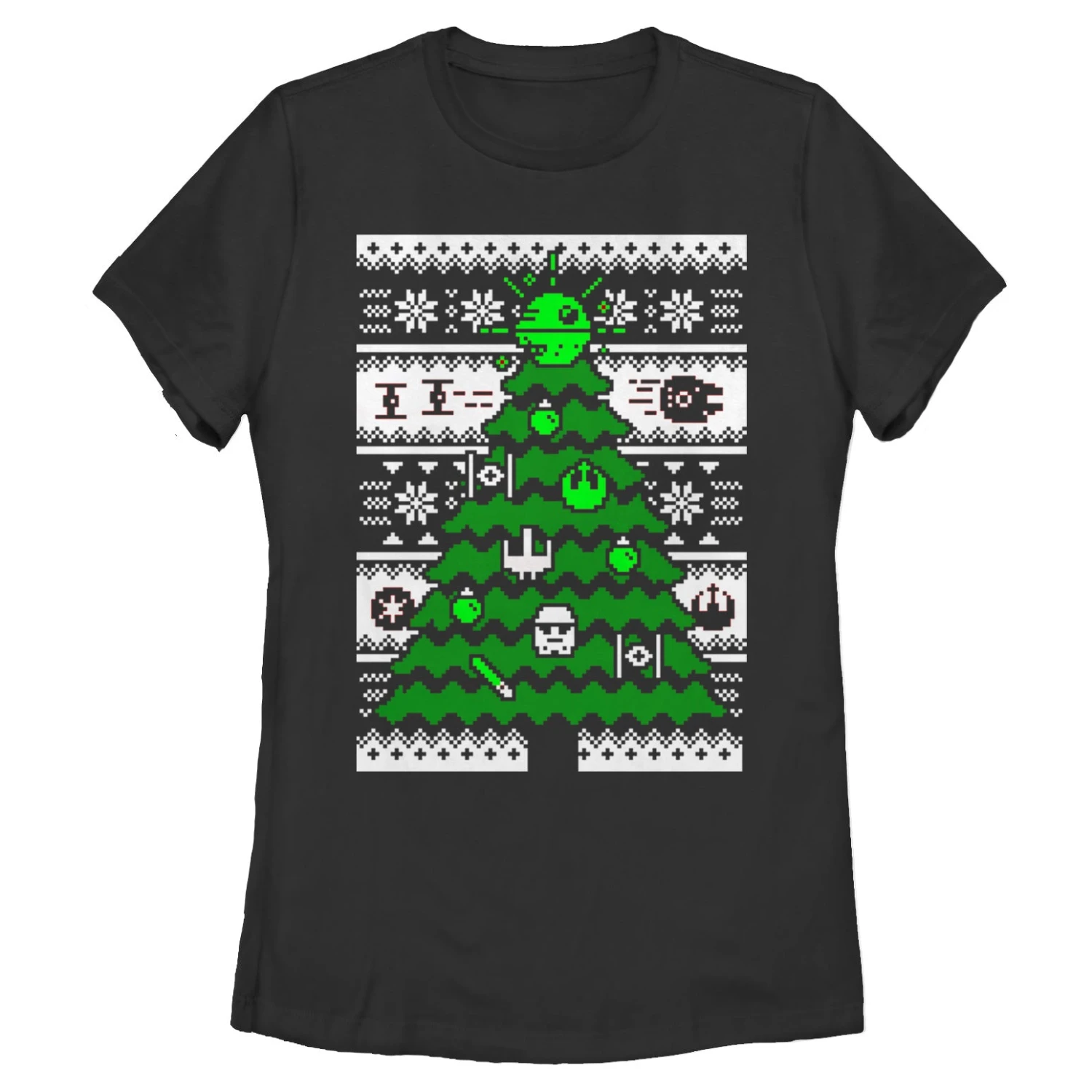 Head to the forest moon of Endor for a topnotch Christmas tree and the Star Wars Ugly Christmas Sweater Tree Women’s T-Shirt! The Death Star sits atop a Christmas tree printed ugly-sweater style with star ships in the background on the front of this awesome Star Wars holiday shirt.