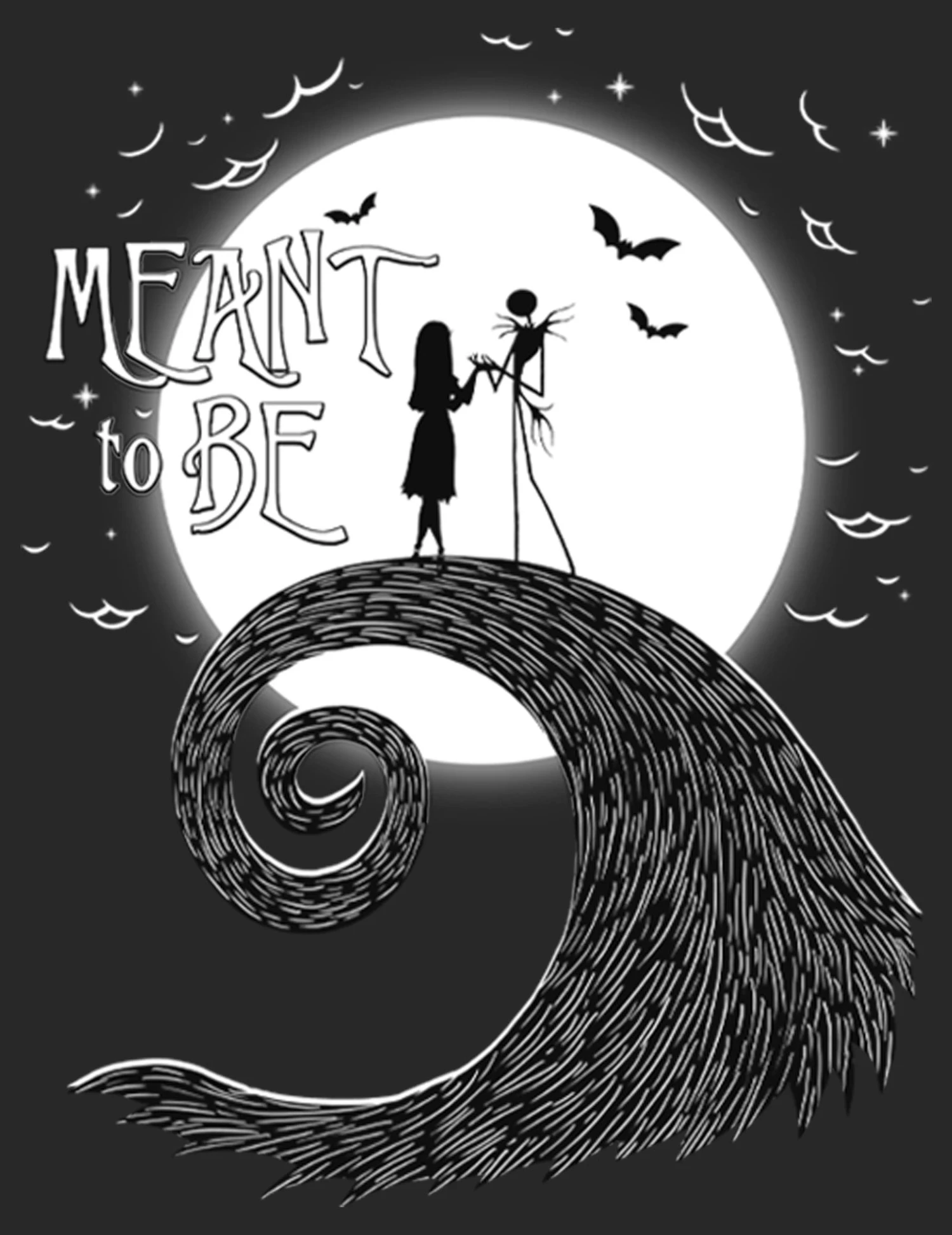 - Strut your stuff with this stylish new Halloween Women’s T-Shirt that is perfect for the Scary season! Featuring the silhouettes of Jack Skellington and Sally on top of Spiral Hill holding hands alongside the text “Meant to Be” and a bright moon in the background.